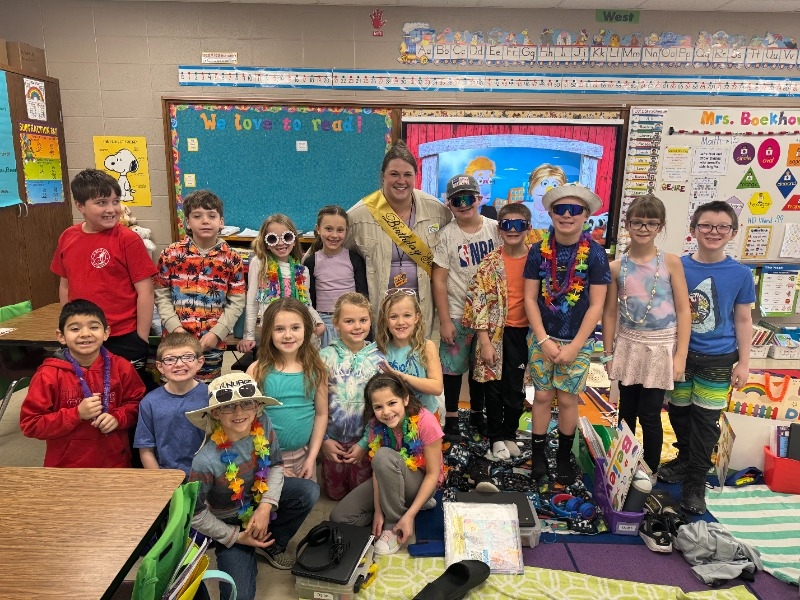 We also reached our classroom PBIS goal this month by earning enough paw prints to have a beach party! Woohoo! Once again, students really went all out and let their traveling tourist, summer vibes shine while relaxing on Boekhout's Beach. While vacationing today, Ms. Kara met up with us to share her cool Ag lesson about cattle. We surprised her by singing happy birthday and giving her a sash to wear so everyone knows it's her special day. She always makes learning science so much fun! As you can probably tell, it definitely felt like it was 80 degrees and sunny with all of the laughter and smiles in our classroom today. Next month, we will be working on earning a Read and Feed! For now though, it's time to catch our flight (bus) home as we head back out in to the cold reality of winter weather here in Iowa.
