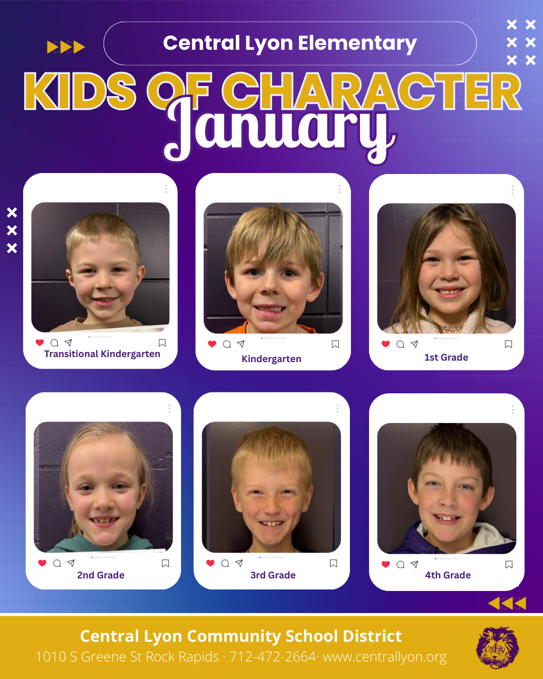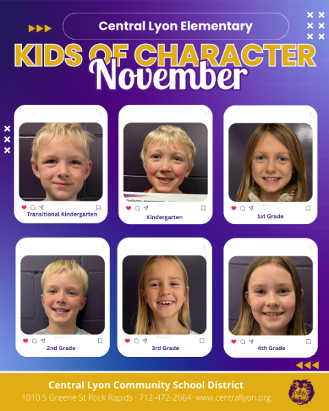 Elementary students at Central Lyon are taught that our four core expectations are to Respect All, Offer Help, Accept Responsibility, and Reach Expectations (ROAR). Staff acknowledge students following those expectations by giving them “ROAR cards” to point out what they were doing well. The cards are collected in a tote by the office. The cards are counted and six ROAR cards are drawn to recognize students who have demonstrated our Central Lyon ROAR expectations during that month. These students are known as “Lion Kids of Character” and are awarded a certificate to thank them for demonstrating our core expectations. Congratulations to these Lion Kids of Character! Way to ROAR!